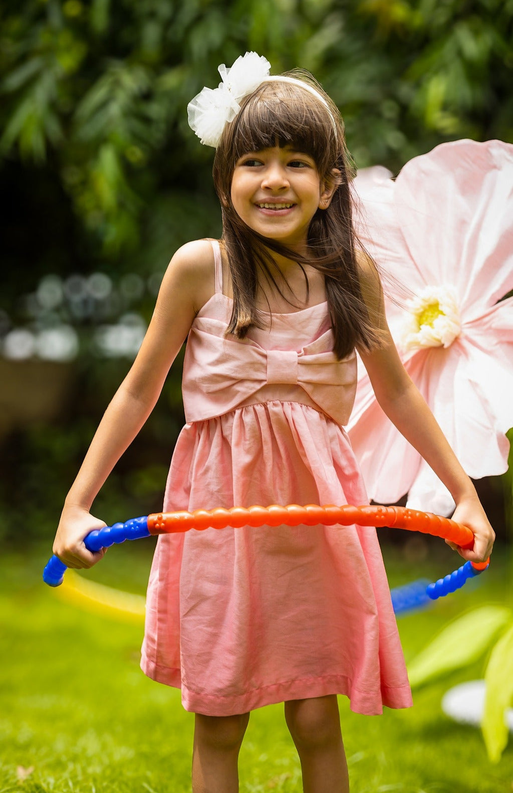 Brighten up her wardrobe with this charming pink cotton bow dress, crafted for both comfort and style. The sleeveless cut and breathable fabric make it perfect for active play, while the bow detail at the waist adds a touch of sweetness. Whether it’s a sunny day outdoors, a birthday celebration, or a casual family outing, this dress brings together comfort, style, and cuteness in one delightful outfit.